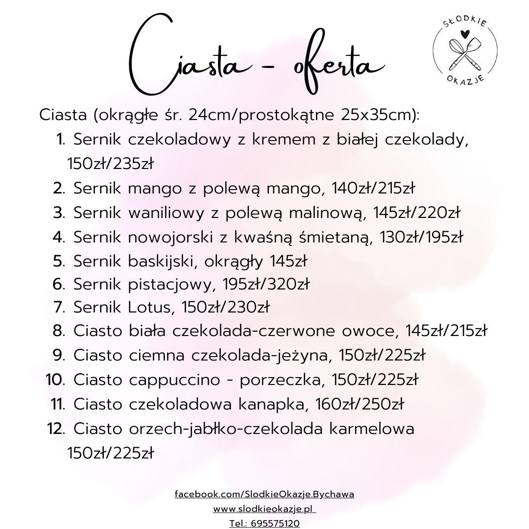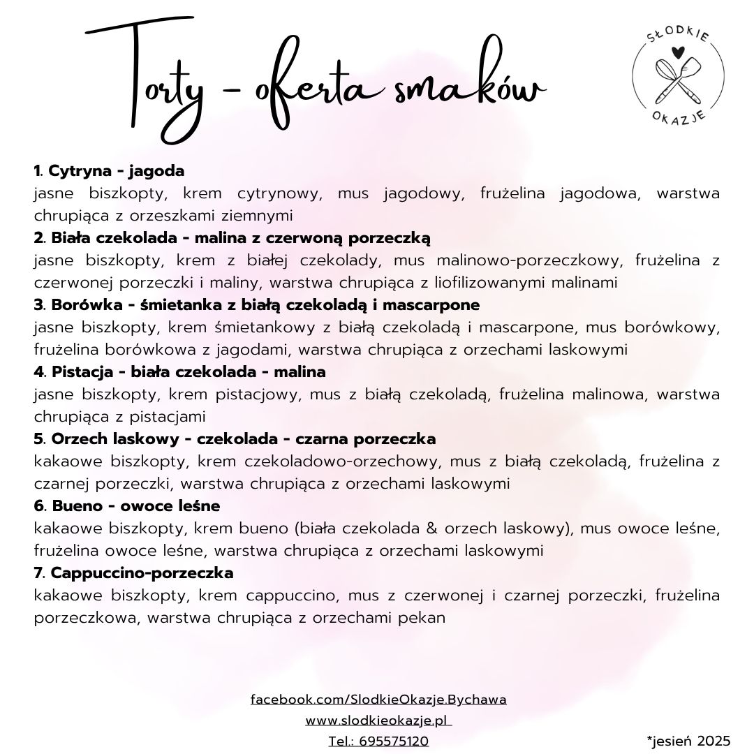 Poza tortami oferuję też serniki, ciasta przekładane i drobne słodycze. Szczegóły ustalamy indywidualnie, a poniższa oferta ma charakter informacyjny i nie jest ofertą handlową. Skontaktuj się ze mną, aby uzyskać aktualną ofertę smaków i wycenę.