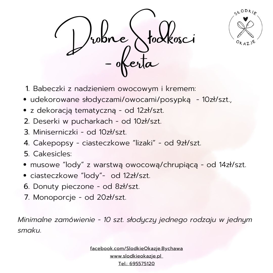 – drobne słodycze: babeczki, cakepoposy (ciasteczkowe lizaki), cakesicles (lody ciasteczkowe i musowe), ciastka, deserki w pucharkach, donuty, miniserniczki, monoporcje, lizaki bezowe.
