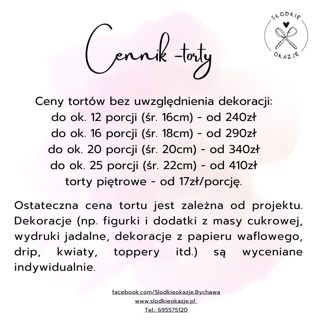 Wpływ na cenę ma wielkość tortu (ilości porcji) oraz rodzaj i ilość dekoracji.